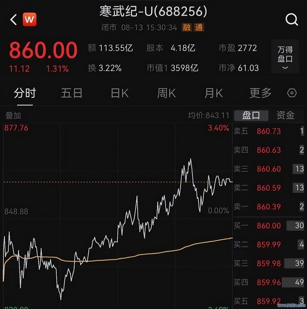 投资者一看,觉得这下可能要凉,但没想到第二天8月13日,开盘虽跌近3%,后来却翻红,收盘涨1.31%,稳稳站上860元,总市值3597.81亿元。